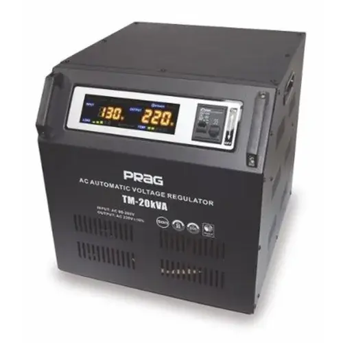 The Prag 20KVA Relay Voltage Stabilizer is a powerful stabilizer designed for heavy-duty appliance protection. It efficiently handles a wide input voltage range from 45V to 280V, providing a stable 220V output. This wall-mounted stabilizer features a relay control system that offers fast response to voltage fluctuations, making it ideal for areas with frequent power instability.