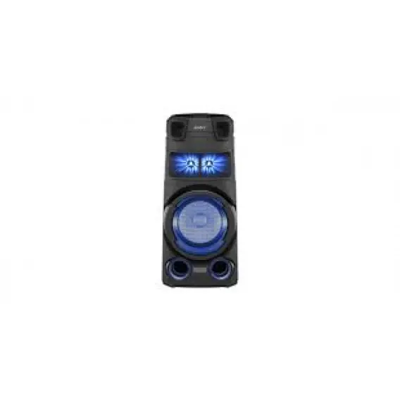 The Sony V73 High Power Audio system features a powerful sound output designed for dynamic music playback. It includes Bluetooth connectivity for seamless wireless streaming from any compatible device. The system comes with LED party lights that enhance the atmosphere during events. It supports karaoke functions with microphone inputs for lively sing-alongs. With multiple audio inputs, including USB and AUX, you can connect various devices. The DJ effects add excitement to your music experience, while the user-friendly interface makes operation simple.