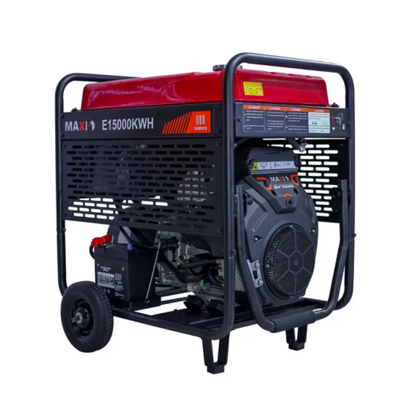 The Maxi E15000KWH Generator is a robust and high-performance 3-phase generator designed to deliver 15 kW continuous power and a peak capacity of 18.75 kVA, making it ideal for industrial, commercial, and large residential applications. Powered by a 4-stroke gasoline engine with 100% copper windings, this generator ensures greater efficiency, durability, and longevity. The 60L fuel tank provides extended run times, reducing the need for frequent refueling. With a key starter system, the E15000KWH is quick and easy to operate. The battery start feature allows for convenient push-button ignition, while the oil alert system ensures engine protection by automatically shutting down the unit when oil levels are low. With wheels and handles, it is designed for easy mobility, making it an excellent solution for large power needs in construction sites, factories, or outdoor events.