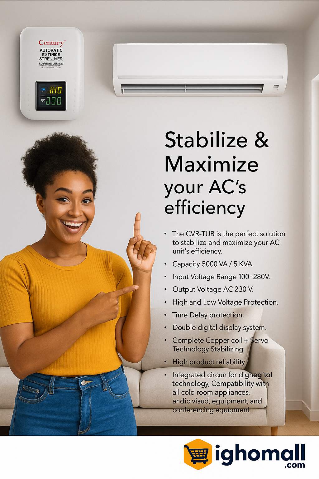 The CVR-TUB 5000VA-B Stabilizer is engineered to stabilize and enhance the efficiency of air conditioning units, making it the ideal choice for systems up to 3.0HP. With the ability to operate from input voltages as low as 100V, this stabilizer ensures your appliances run smoothly, even in challenging electrical conditions. Featuring advanced safety mechanisms like overheat and overload protection, double relays with zero cross switching technology, and a user-friendly digital display, this device offers comprehensive power management. The wall-mounted and slim design makes it a practical addition to any space.