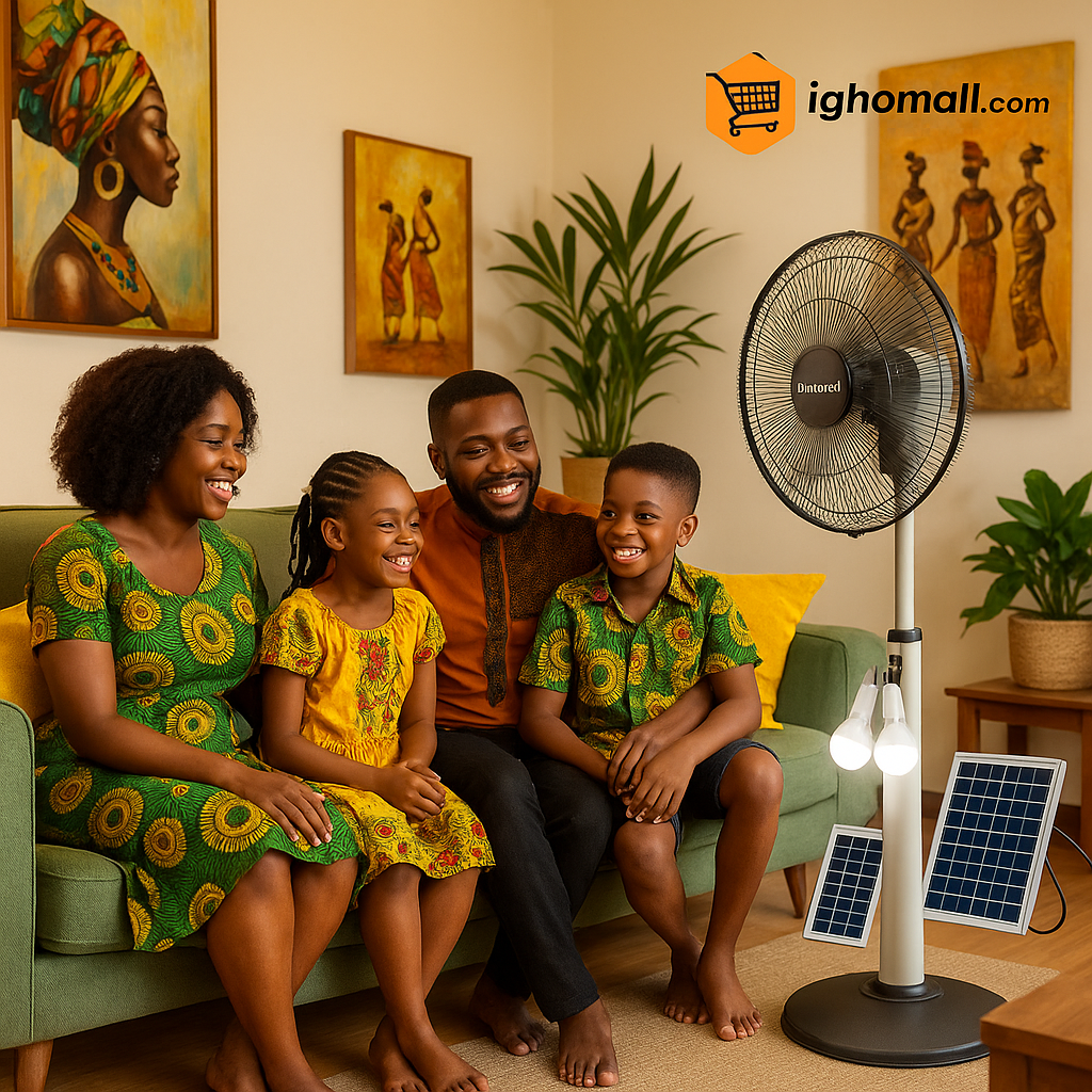 Stay cool and enjoy bright lighting with the Duravolt 3-in-1 18 Inches Rechargeable Fan with Solar Panel & 2 LED Bulbs. Perfect for Nigerian homes — no more NEPA wahala! Shop original Duravolt fans online now at Ighomall.com.