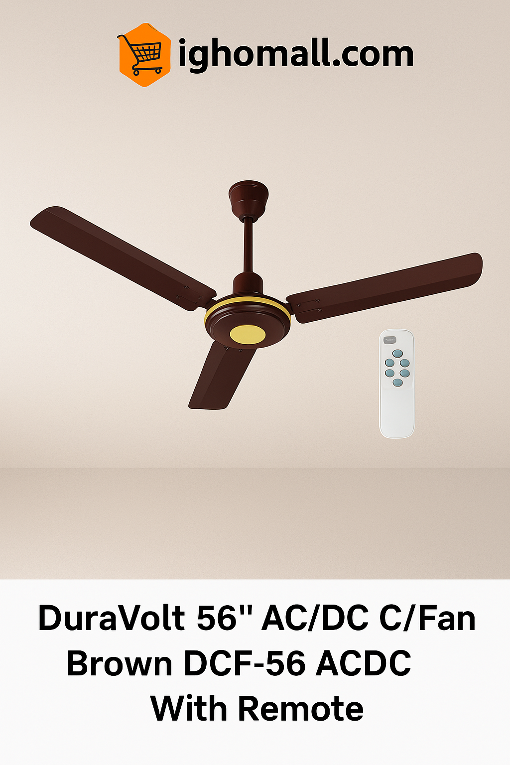 The DuraVolt 56" AC/DC Ceiling Fan is engineered for ultimate convenience and energy efficiency. It features dual power compatibility, operating seamlessly on both AC and DC power sources, ensuring consistent performance during power outages. This 56-inch fan delivers powerful airflow with minimal noise, ideal for larger spaces. Equipped with a stylish remote control, it allows you to adjust speeds effortlessly, while the sleek brown finish complements any interior décor. With low energy consumption and high durability, this fan is designed to provide reliable cooling year-round.