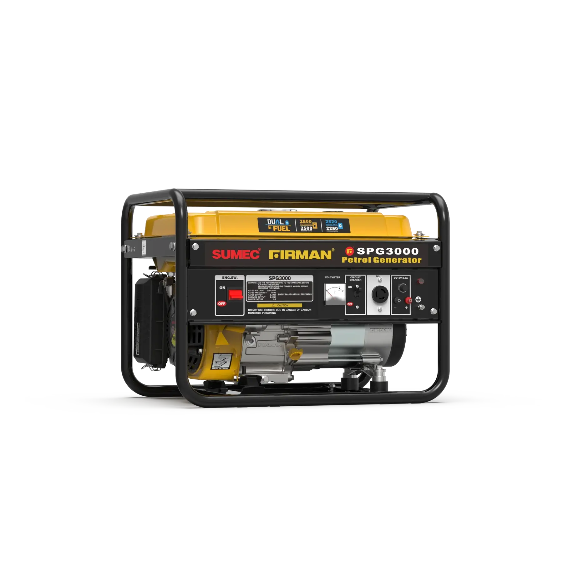 Introducing the Firman SPG3000 2.5kVA Dual Fuel Manual Generator, a versatile and reliable power solution designed to meet your single-phase power needs. With the flexibility to operate on both petrol and gas, this generator provides a maximum AC output of 2.8kVA on petrol and 2.52kVA on gas. Powered by a 6.5HP SPE200 engine and featuring a self-exciting alternator, it ensures dependable performance for a variety of applications. Whether you're at home, camping, or on a work site, this generator provides a 14-hour run time at 50% load thanks to its 15L petrol tank. Its compact design (605x440x460mm) and 44kg weight make it easy to transport and store, while maintaining a 68dB noise level at 7 meters, making it ideal for both residential and outdoor use.