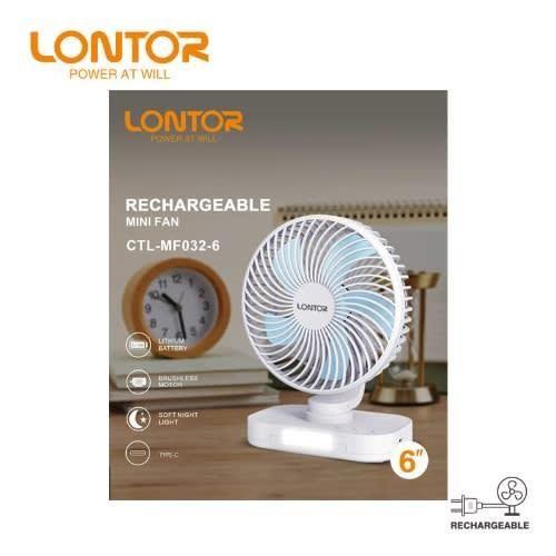 The Lontor CTL-MF032-6 Rechargeable Mini Fan is a compact and efficient cooling solution, ideal for personal use both indoors and outdoors. Equipped with a 2400mAh lithium battery, it offers up to 4 hours of continuous operation on a single charge. The fan features a sleek design, lightweight construction, and multiple speed settings, making it convenient for travel and daily use. It also includes a 120° adjustable design and LED night light function, enhancing its versatility and user-friendliness.