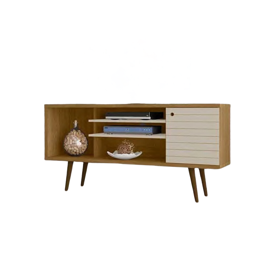 The MAXI Safira TV Stand in Natural is designed for sleek, modern living spaces. It features a 135 cm wide platform suitable for large screen TVs. The stand offers ample storage space with two open compartments and two closed drawers for easy organization of entertainment essentials. Crafted with a natural wood finish, it blends seamlessly with various home décor styles. Its durable build ensures longevity, making it a perfect choice for any home.