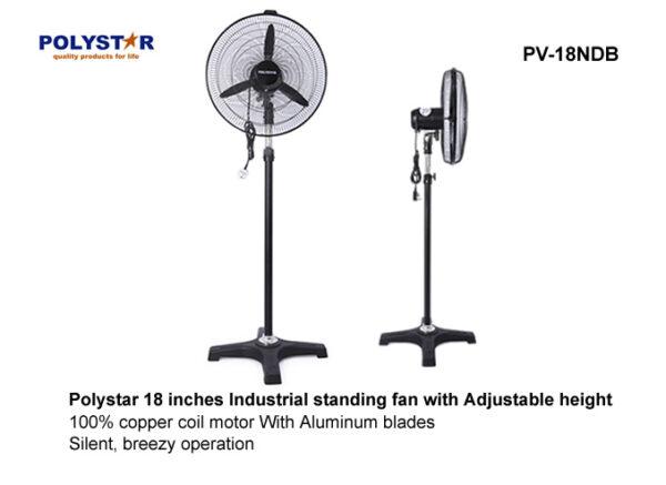 The Polystar 18” Industrial Fan is engineered for powerful performance and versatility, making it an excellent choice for various settings. Featuring a robust 100% copper coil motor, this fan ensures efficient and reliable operation. The aluminum blades provide excellent airflow while maintaining a lightweight design. With adjustable height functionality, you can customize the fan's position to suit your cooling needs. Enjoy silent, breezy operation, making it perfect for both industrial environments and home use.