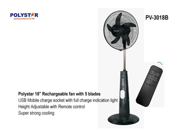 - Model: Polystar 18” Rechargeable Standing Fan – PV-3018B-USB