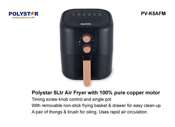 The POLYSTAR 5L Air Fryer is the perfect kitchen companion for healthy cooking without sacrificing flavor. Featuring a powerful 100% pure copper motor, this air fryer utilizes rapid air circulation technology to deliver crispy results with minimal oil. Its user-friendly design includes a timing screw knob control and a single pot for effortless cooking. Cleanup is a breeze with the removable non-stick frying basket and drawer.