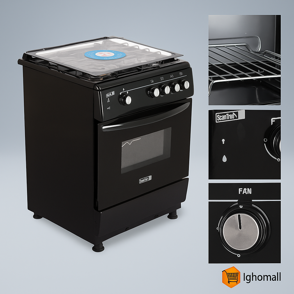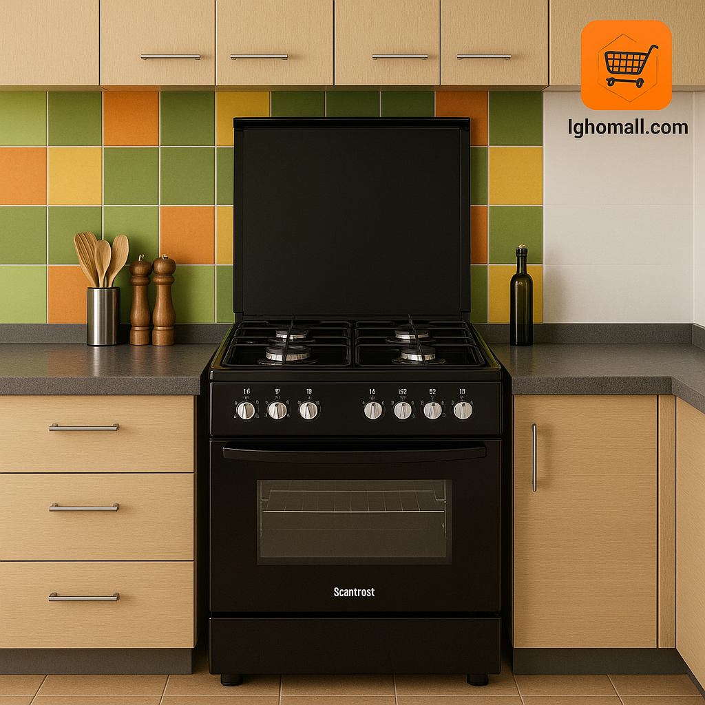 The Scanfrost 60x60 4 Gas Burners with Gas Oven, Grill, and Burner Ignition in black is a robust and stylish cooking appliance designed for efficiency and elegance. Featuring four gas burners, a spacious gas oven with an integrated grill, and a convenient ignition system, this model showcases a sleek black finish that complements contemporary kitchen designs.