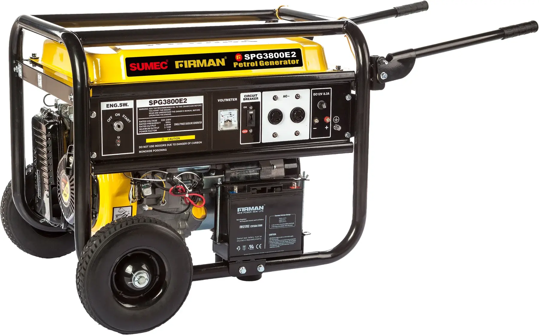 The Sumec Firman SPG3800E2 is a powerful 3.5kVA key start generator that provides reliable power for a wide range of applications, including household appliances, small machinery, and tools. With a rated capacity of 3.5kVA and a maximum load of 3.8kVA, it is perfect for powering multiple devices simultaneously, such as TVs, fridges/freezers, and air conditioners. The generator features a 25L petrol fuel tank, allowing for extended run times, and is equipped with both recoil and electric starting systems for easy operation. Its 100% copper coil ensures maximum efficiency and longevity. Designed with handle and wheels, it is highly portable despite its 79.3kg weight, making it ideal for both residential and outdoor use.